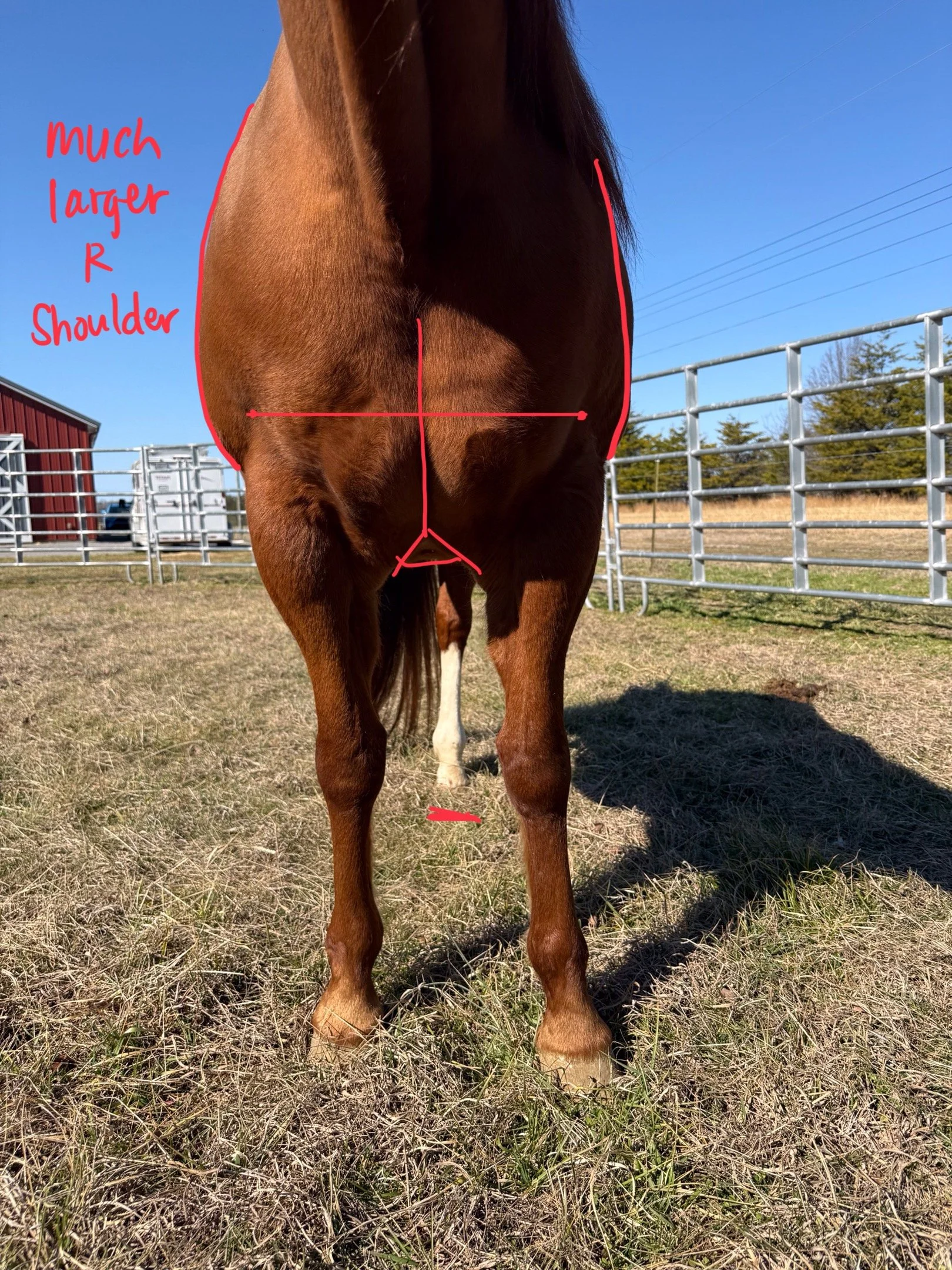Compensation patterns can get a bit confusing when we’re compensating for multiple old injuries in both the hind end, ribcage, and forelimb, but this static posture is consistent with what I would expect to see in a horse with this history who was never completely rehabilitated from their injuries.